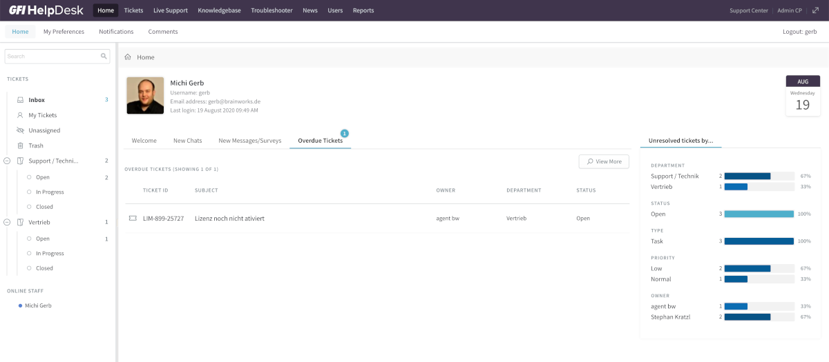 Mit GFI HelpDesk können diese Ziele erfolgreich umgesetzt werden: Support-Tickets, Knowledgebase, Newsfeed und ein dazugehöriges Reporting sind zukünftig gemeinsam in dieser kostengünstigen OnPremise Helpdesk-Lösung von GFI zu finden.